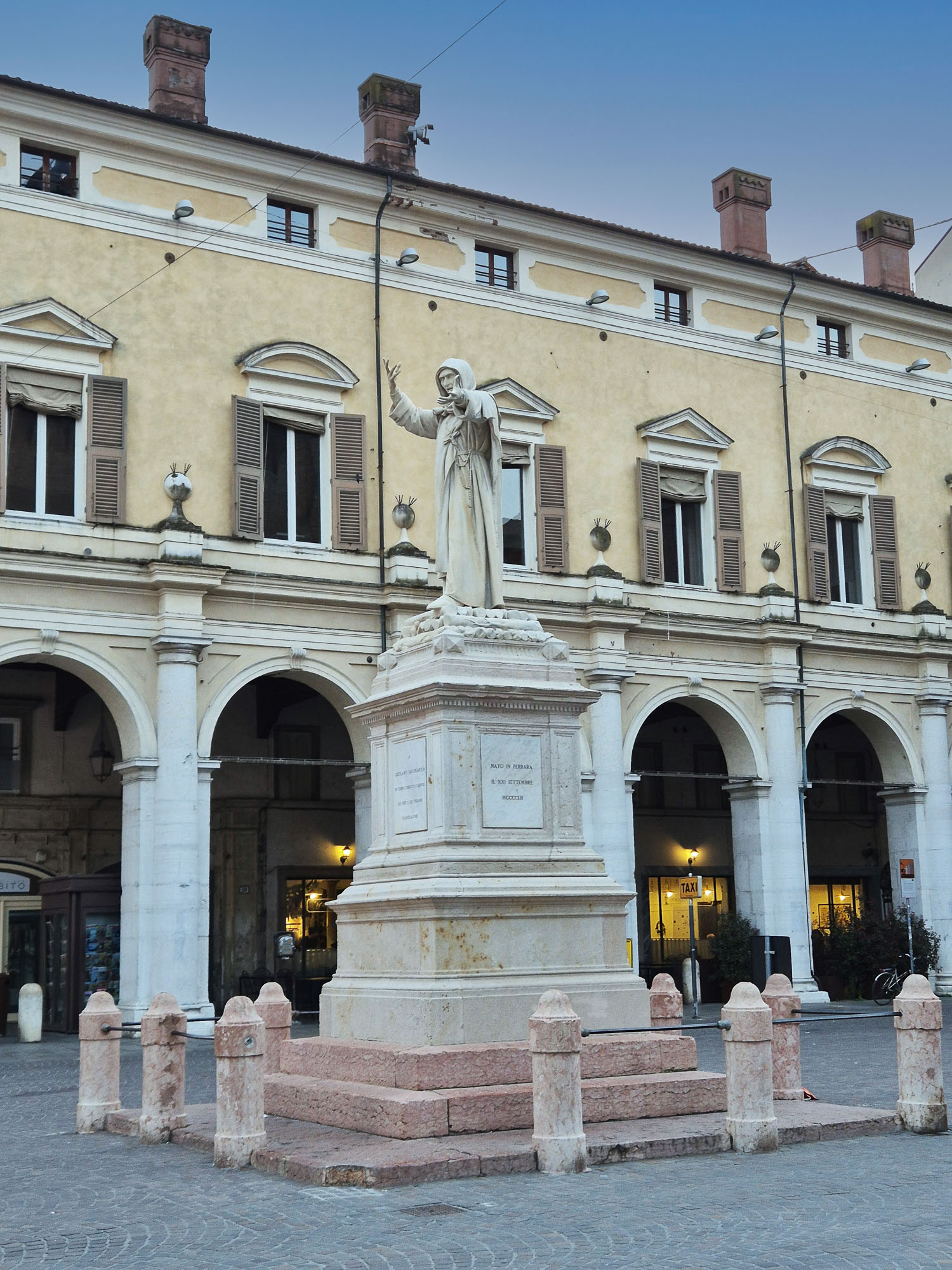 Piazza Savonarola è uno degli angoli più tranquilli e scenografici di Ferrara, dominata dalla statua imponente del frate ferrarese che veglia sulla città. Intorno, piccoli ristorantini e dehors creano un’atmosfera raccolta, ideale per una pausa tra storia e gusto. La piazza unisce silenzio, architettura e vita locale, diventando uno dei luoghi più piacevoli da vivere al tramonto.