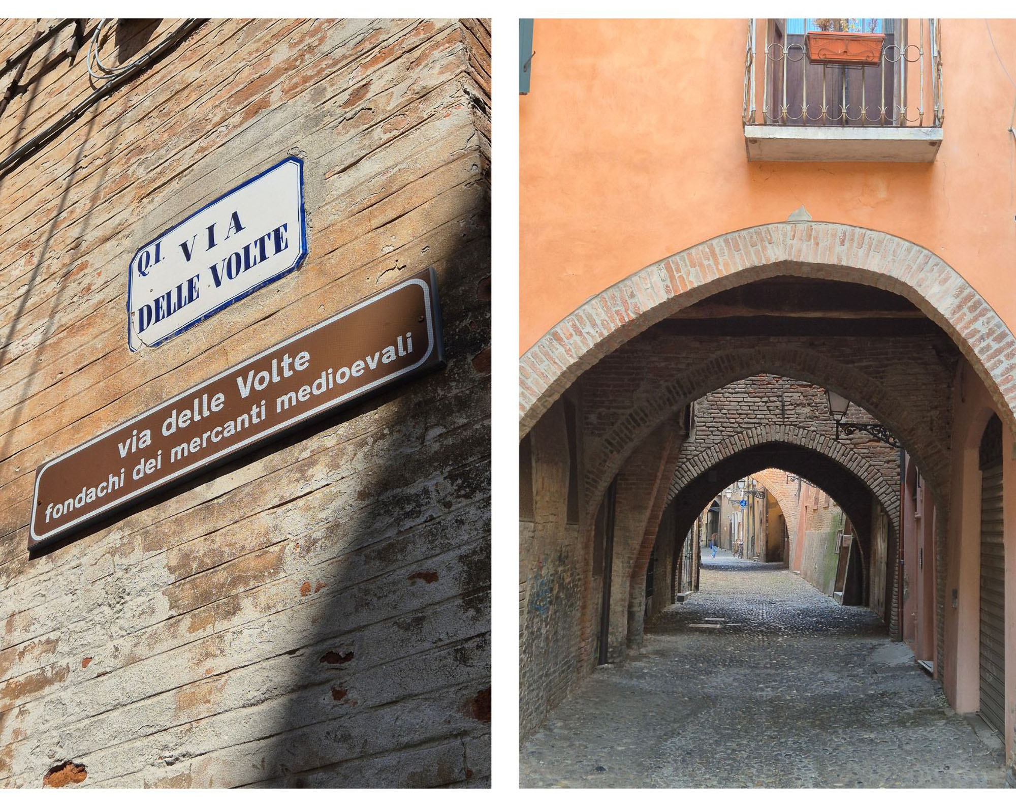 Via delle Volte è una delle strade più antiche di Ferrara, un corridoio medievale caratterizzato da archi che collegano gli edifici su entrambi i lati. Queste strutture sostenevano i piani superiori, dove si trovavano abitazioni e magazzini dei mercanti. I fondachi, infatti, avevano bisogno di spazi ampi e sicuri per conservare merci, tessuti e prodotti provenienti dai traffici fluviali. Le volte creavano zone d’ombra e riparo, utili per lavorare e per proteggere le merci dal sole e dalla pioggia. I passaggi sopraelevati permettevano ai mercanti di muoversi tra un edificio e l’altro senza scendere in strada.
