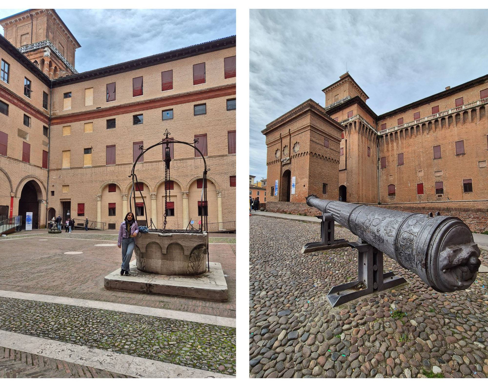 Il pozzo storico al centro del cortile del Castello Estense racconta la vita quotidiana della fortezza: un dettaglio semplice ma potentissimo, incorniciato da mura che profumano di Rinascimento. Il cannone posizionato all’esterno del castello ricorda la sua anima difensiva: un simbolo di potere militare che contrasta con l’eleganza architettonica della residenza estense.