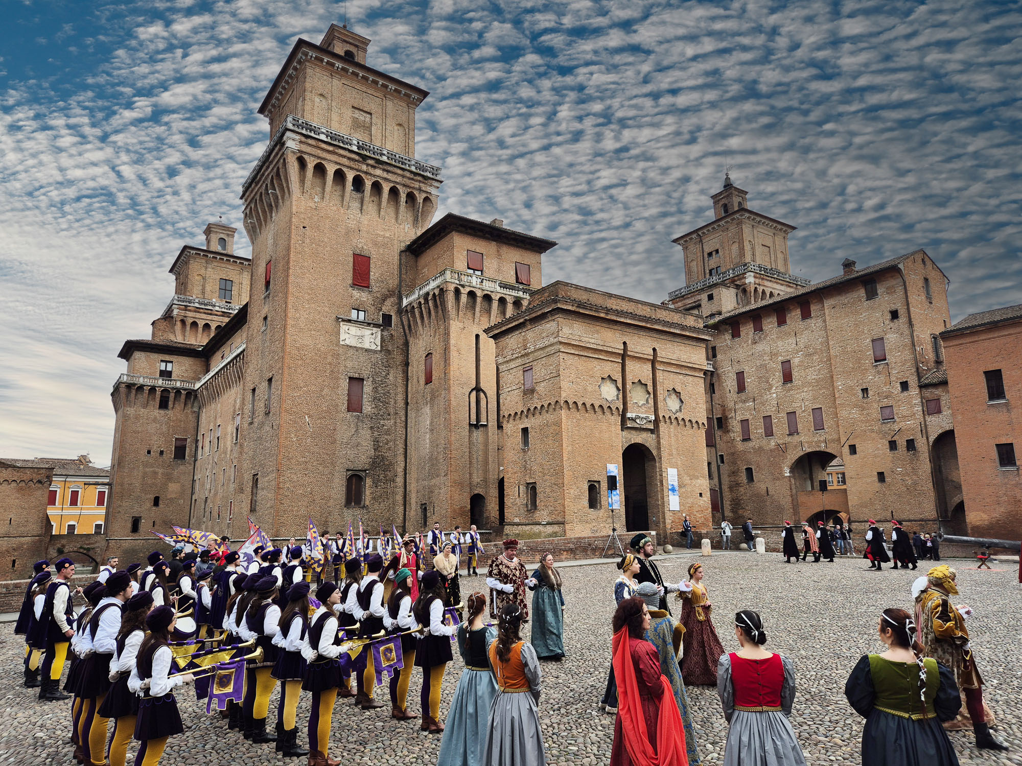 In piazza Castello, nel mese di marzo, ho assistito all’Omaggio al Duca, la rievocazione storica che precede il Palio di Ferrara. Le otto contrade della città sfilano nel cortile del Castello Estense (le domeniche di marzo e aprile) portando i loro colori, i vessilli e i doni simbolici destinati al Duca. Tra tamburi, chiarine e costumi d’epoca, l’atmosfera diventa un tuffo nel passato che racconta l’identità più autentica di Ferrara. Un momento suggestivo che apre ufficialmente il cammino verso il Palio di maggio.