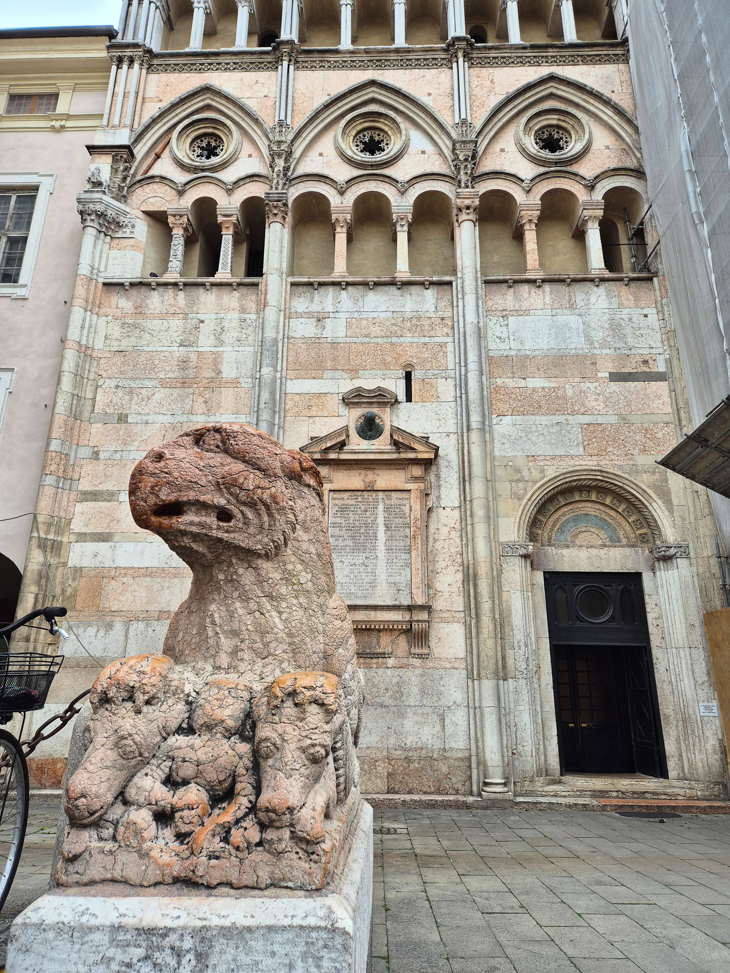 Il Duomo domina il centro di Ferrara con la sua facciata romanico-gotica, un intreccio di archi, logge e sculture che raccontano secoli di storia estense. Ai piedi del portale spicca il leone in pietra, simbolo di forza e protezione, che accoglie i visitatori fin dal Medioevo. Il contrasto tra la monumentalità della cattedrale e la fierezza del leone crea uno degli scorci più iconici della città.
