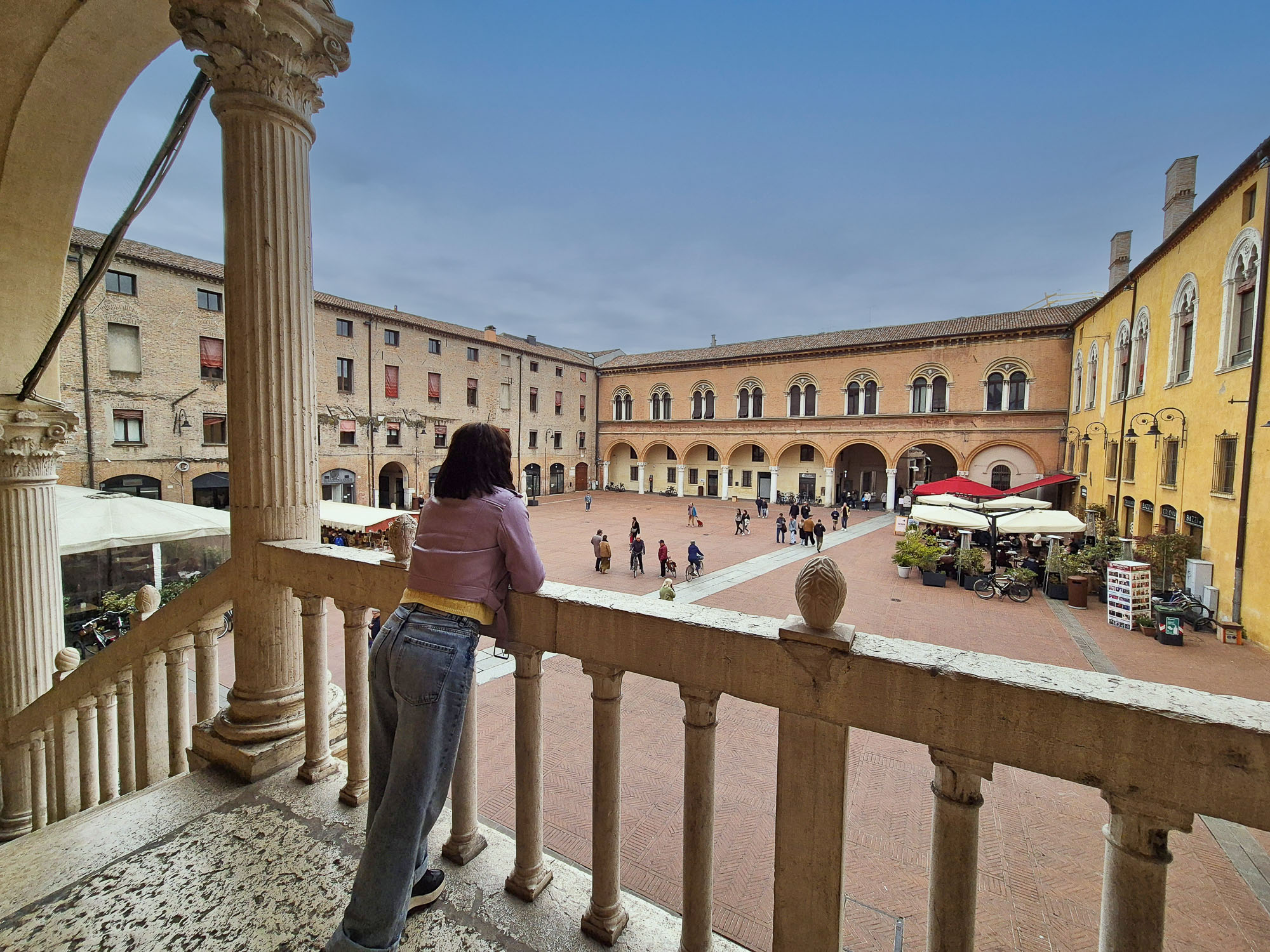 Piazza del Municipio è l’antico cortile ducale degli Este, uno spazio raccolto che conserva l’eleganza rinascimentale del palazzo. Attraverso il Volto del Cavallo si entra in un ampio cortile circondato da logge, archi e dettagli storici. A dominare la scena è lo Scalone Monumentale, la grande scalinata marmorea che collegava gli appartamenti ducali. Un angolo di Ferrara che racconta il potere e la vita di corte con una scenografia ancora intatta.